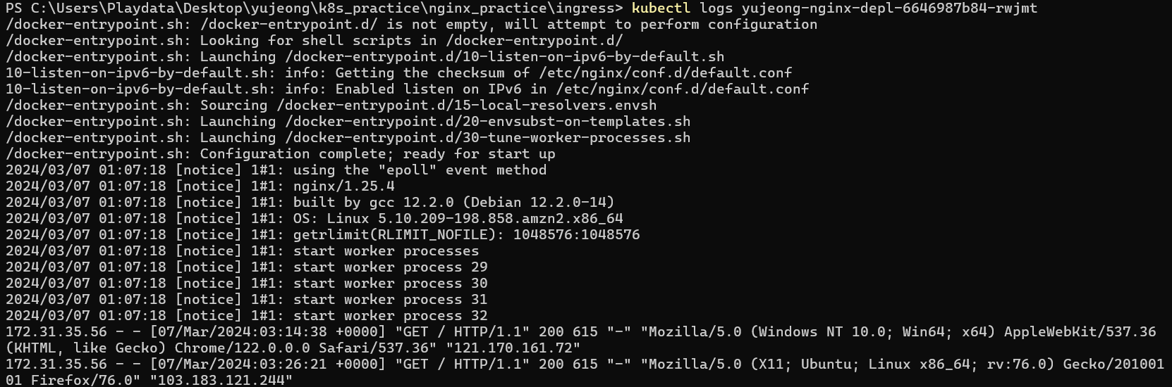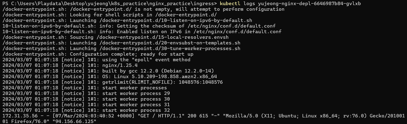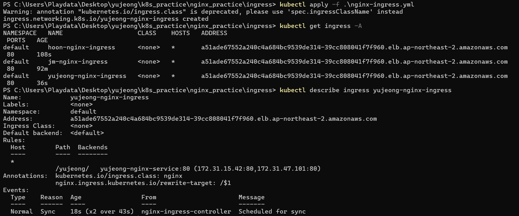 로드 밸런서로 server.yujeong.shop/yujeong/ 요청 받음 -> ingress가 yujeong-nginx-service로 서비스 라우팅이 되는 것.