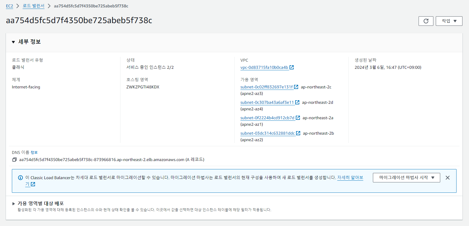 알아서 80포트를 연 보안 그룹을 하나 만들어서 배정해줬다. 타겟 그룹에 ec2 두 대도 넣어주는 것 같다.