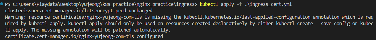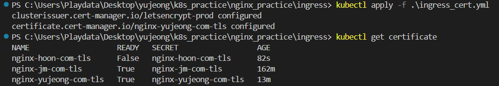 apply 명령어로 ingress, ingress_cert 모두 적용해주고 ~