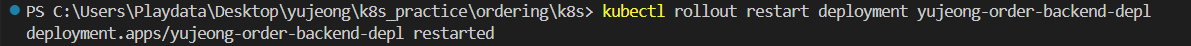 rollout restart 명령어를 통해 현재 올라와 있는 컨테이너(pod, ..)를 업데이트 해줌.