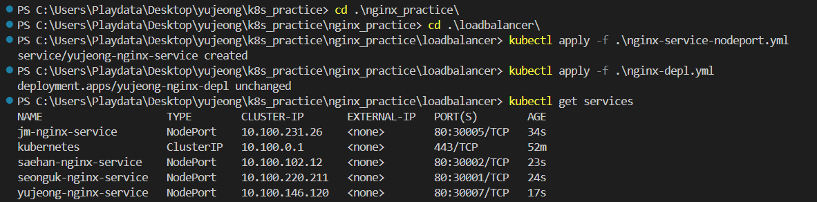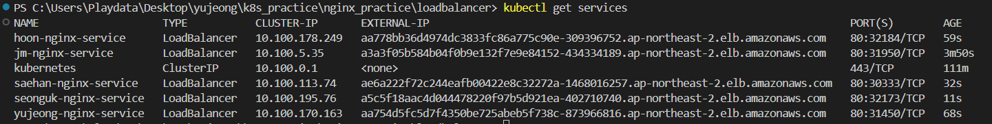각자의 LB가 생성됐고, pod와 연결되는 외부 포트도 각각 생겼다.