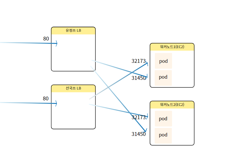 각 LB마다 한 Service로, 각 Service는 pod로 라우팅된다.