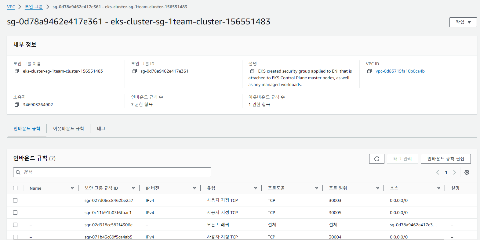 eks가 방금 만들어준 보안 그룹에서 접속하고자하는 포트를 열어준다. 팀원들 것까지 모두 열어줬음 !