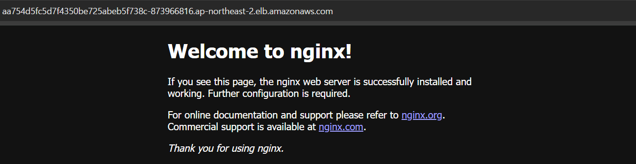 로드밸런서 목록에서 kubectl get services 명령어를 쳤을 때 볼 수 있는 EXTERNAL-IP를 검색하면 해당 로드밸런서를 찾을 수 있는데, DNS 주소로 들어가보면 nginx를 만날 수 있다.