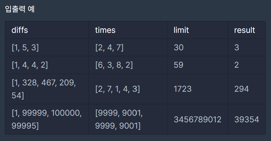 그래서 처음에는 start 값을 무조건 min(diffs)+1로 두고 가장 난이도가 쉬운 문제는 무조건 푼다는 방향으로 잡았는데, 그러면 times 접근 시에도 min(diffs)에 대한 인덱스 값을 고려해줘야 되는 점이 이상해서 다시 생각했다.