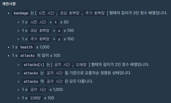 def solution(bandage, health, attacks):