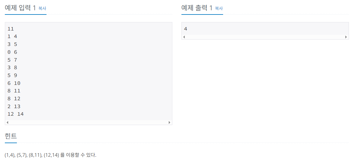 한 개의 회의실이 있는데 이를 사용하고자 하는 N개의 회의에 대하여 회의실 사용표를 만들려고 한다. 각 회의 I에 대해 시작시간과 끝나는 시간이 주어져 있고, 각 회의가 겹치지 않게 하면서 회의실을 사용할 수 있는 회의의 최대 개수를 찾아보자. 단, 회의는 한번 시작하면 중간에 중단될 수 없으며 한 회의가 끝나는 것과 동시에 다음 회의가 시작될 수 있다. 회의의 시작시간과 끝나는 시간이 같을 수도 있다. 이 경우에는 시작하자마자 끝나는 것으로 생각하면 된다.
