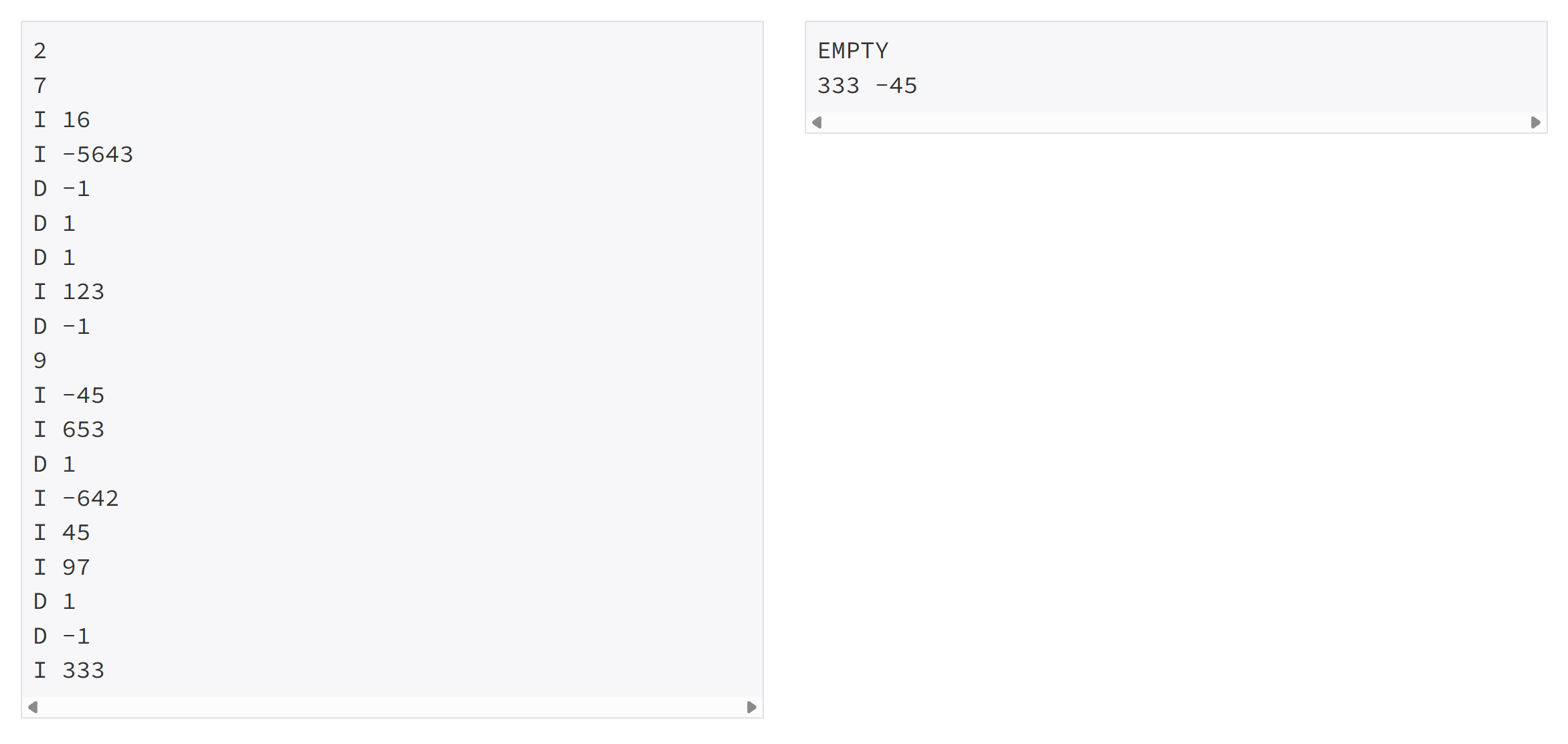 입력 데이터는 표준입력을 사용한다. 입력은 T개의 테스트 데이터로 구성된다. 입력의 첫 번째 줄에는 입력 데이터의 수를 나타내는 정수 T가 주어진다. 각 테스트 데이터의 첫째 줄에는 Q에 적용할 연산의 개수를 나타내는 정수 k (k ≤ 1,000,000)가 주어진다. 이어지는 k 줄 각각엔 연산을 나타내는 문자(‘D’ 또는 ‘I’)와 정수 n이 주어진다. ‘I n’은 정수 n을 Q에 삽입하는 연산을 의미한다. 동일한 정수가 삽입될 수 있음을 참고하기 바란다. ‘D 1’는 Q에서 최댓값을 삭제하는 연산을 의미하며, ‘D -1’는 Q 에서 최솟값을 삭제하는 연산을 의미한다. 최댓값(최솟값)을 삭제하는 연산에서 최댓값(최솟값)이 둘 이상인 경우, 하나만 삭제됨을 유념하기 바란다.