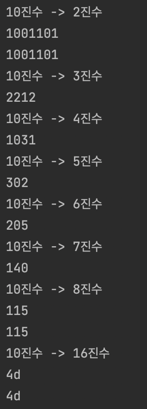 2진수, 8진수, 16진수는 toBinaryString(), toOctalString(), toHexString()함수가 존재한다.