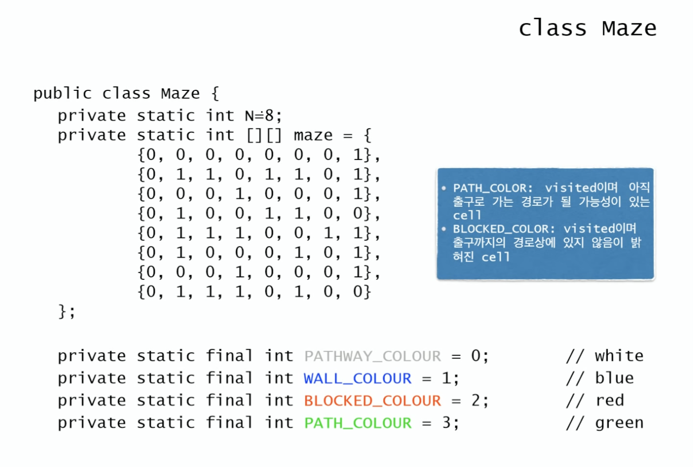 private static final int BLOCKED_COLOUR = 2; // 방문해서 PATH_COLOUR이었다가 경로가 아니라고 판단된 셀