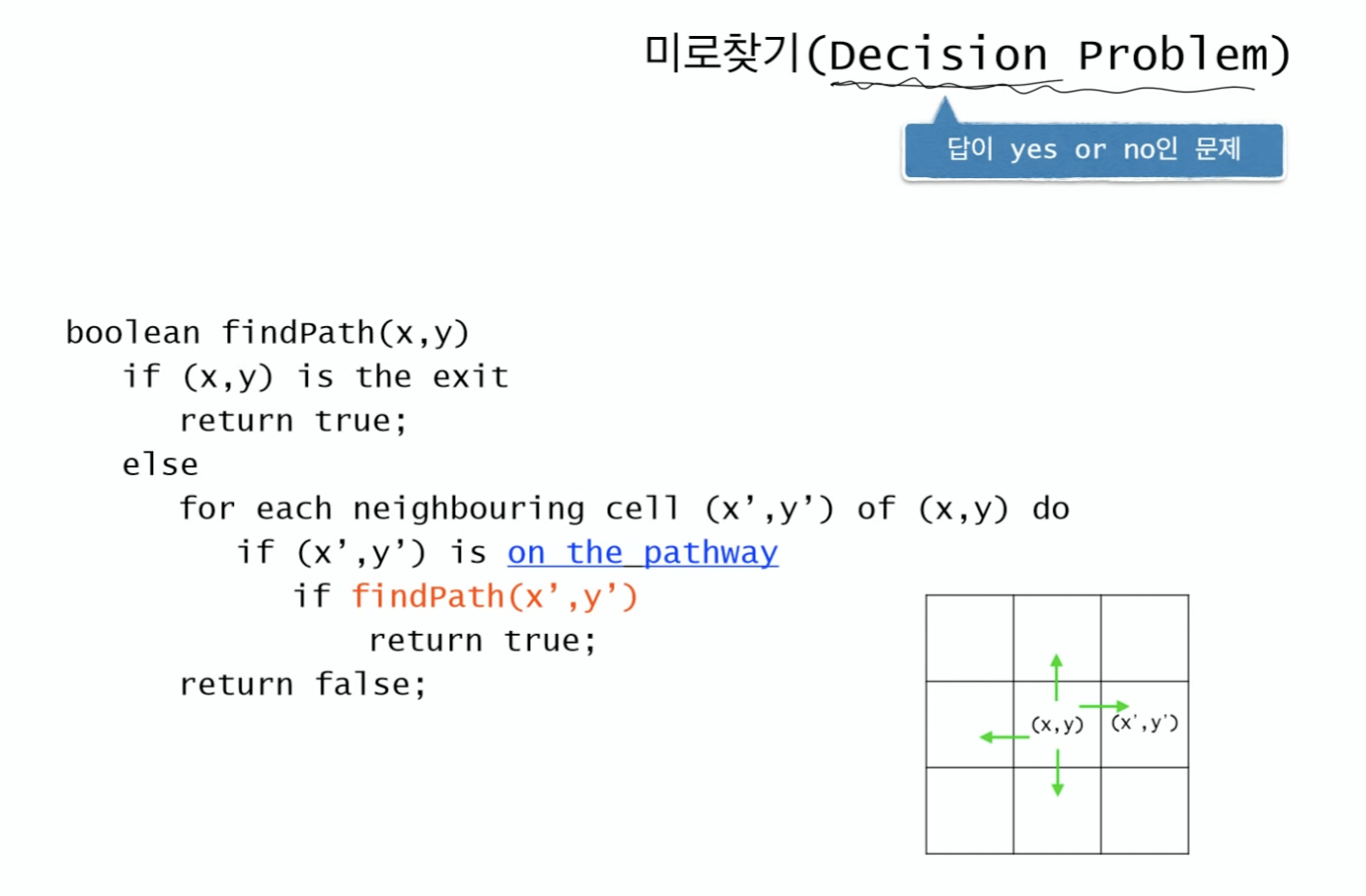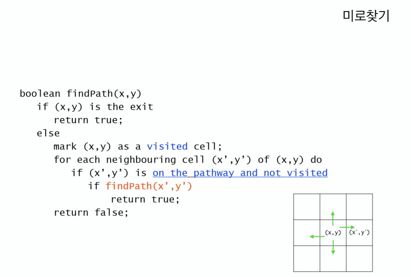 이 경우에는 findPath(x,y)가 인접 셀인 (x',y')를 호출했을 때 findPath(x',y')