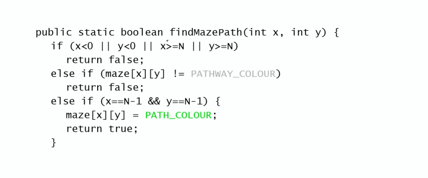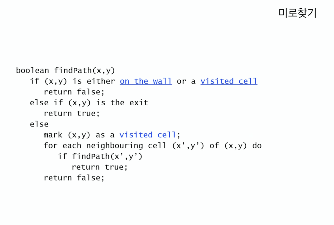 else if (maze[x][y] != PATHWAY_COLOUR) return false; // 방문했던 셀이라면 false