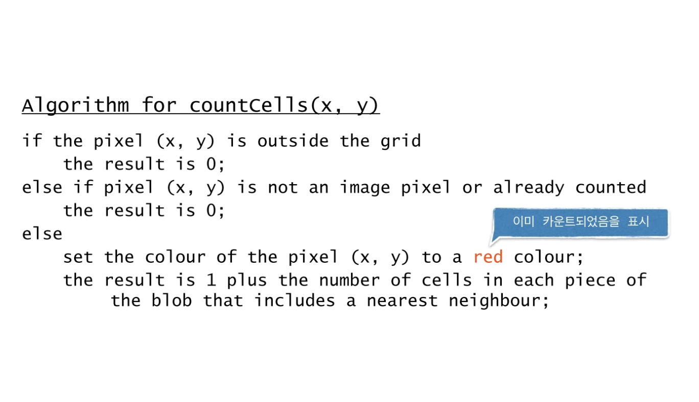 이 과정에서 countCells함수가 재호출(순환)되며, 근접한 픽셀의 근접한 픽셀들까지 모두 체크한 후 blob의 결과를 얻을 수 있다.