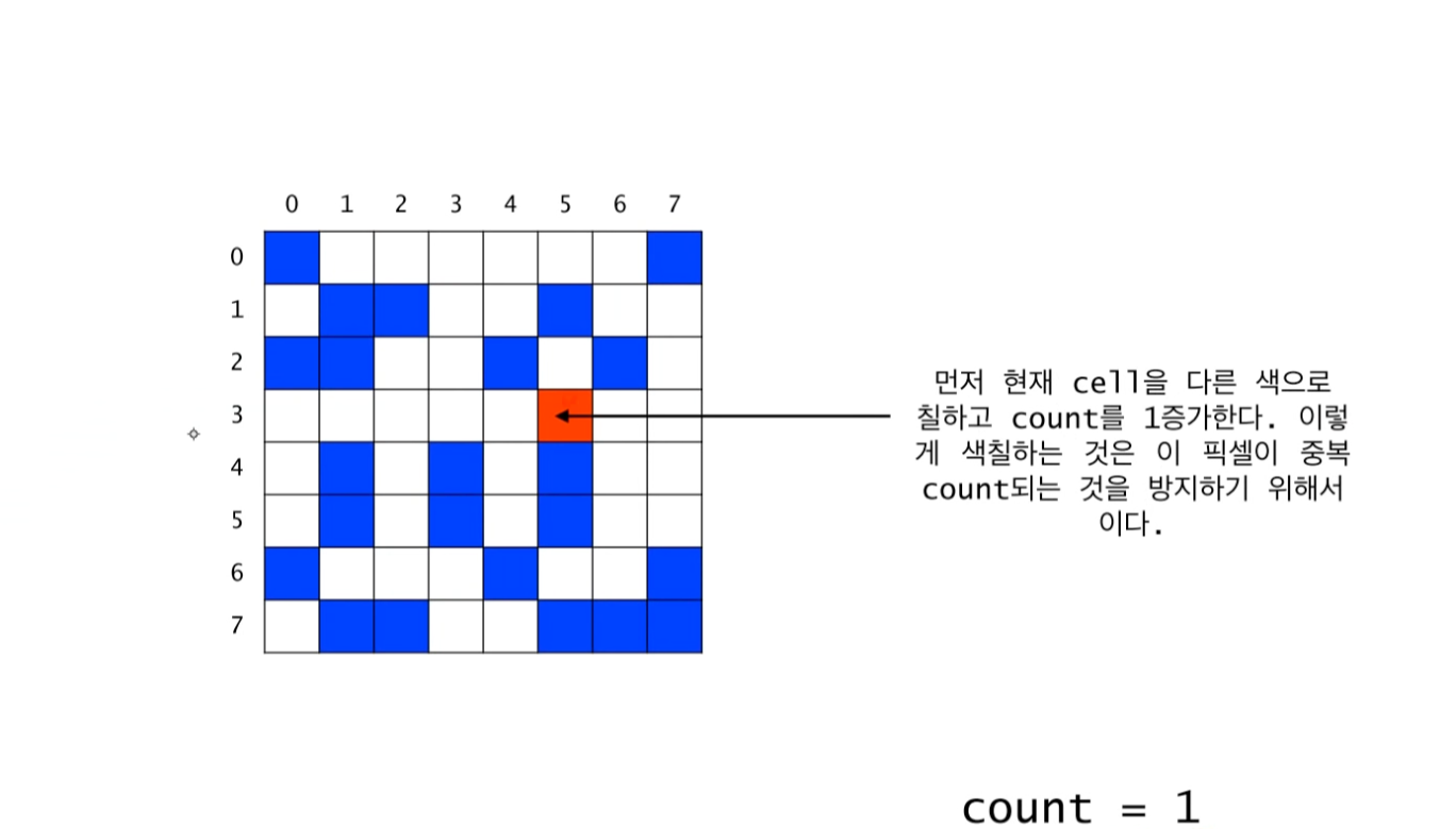 픽셀을 탐색할 때 위 알고리즘처럼 빨간색으로 "이 셀은 방문했다!!"고 표시해두고, 근접 픽셀 중 해당 픽셀과 이어지는 픽셀이 있는지 확인하는 동작을 반복한다.