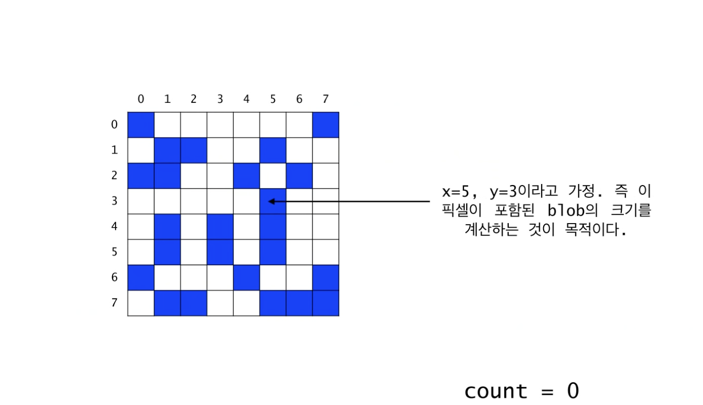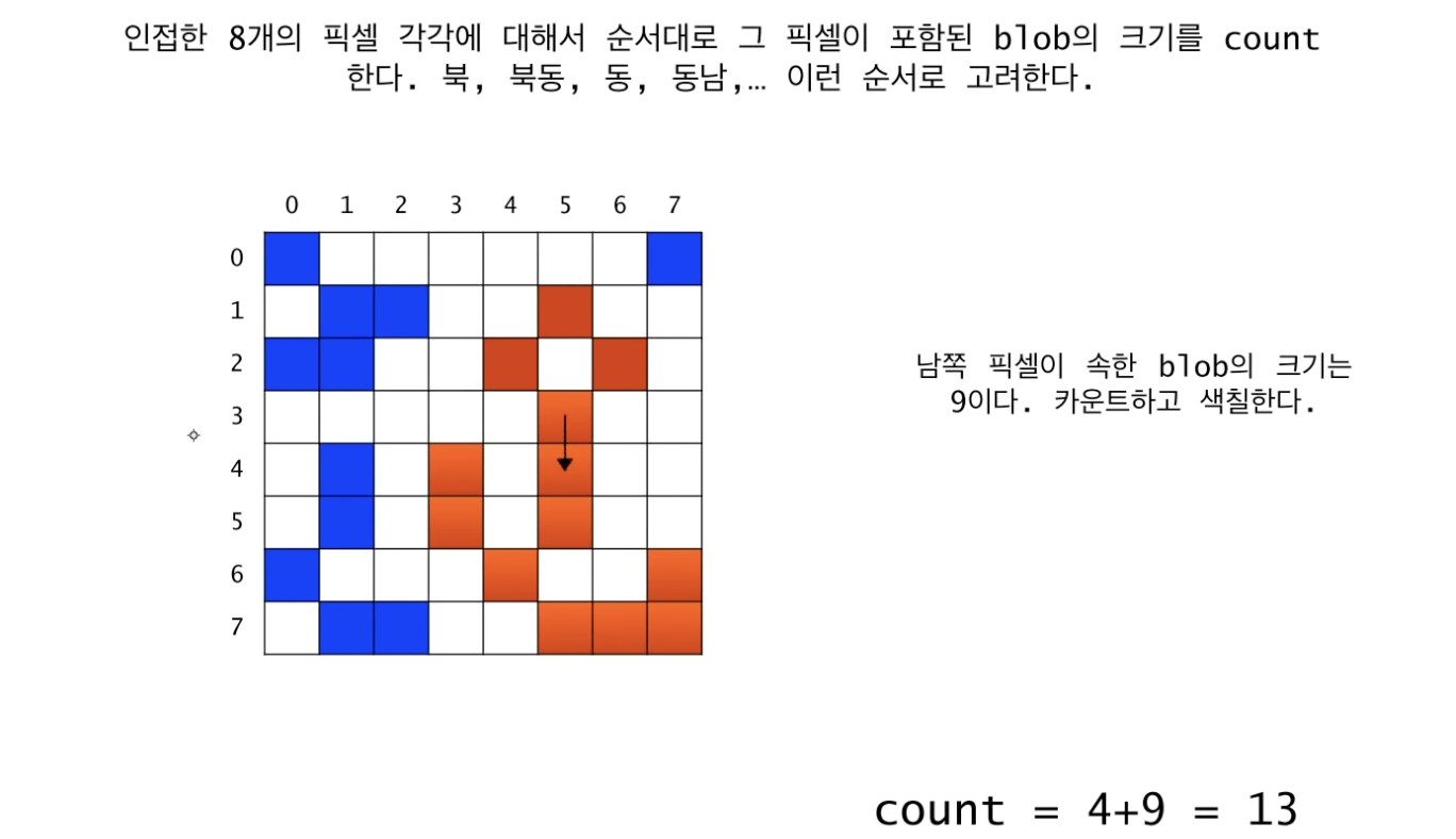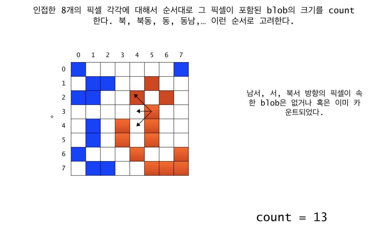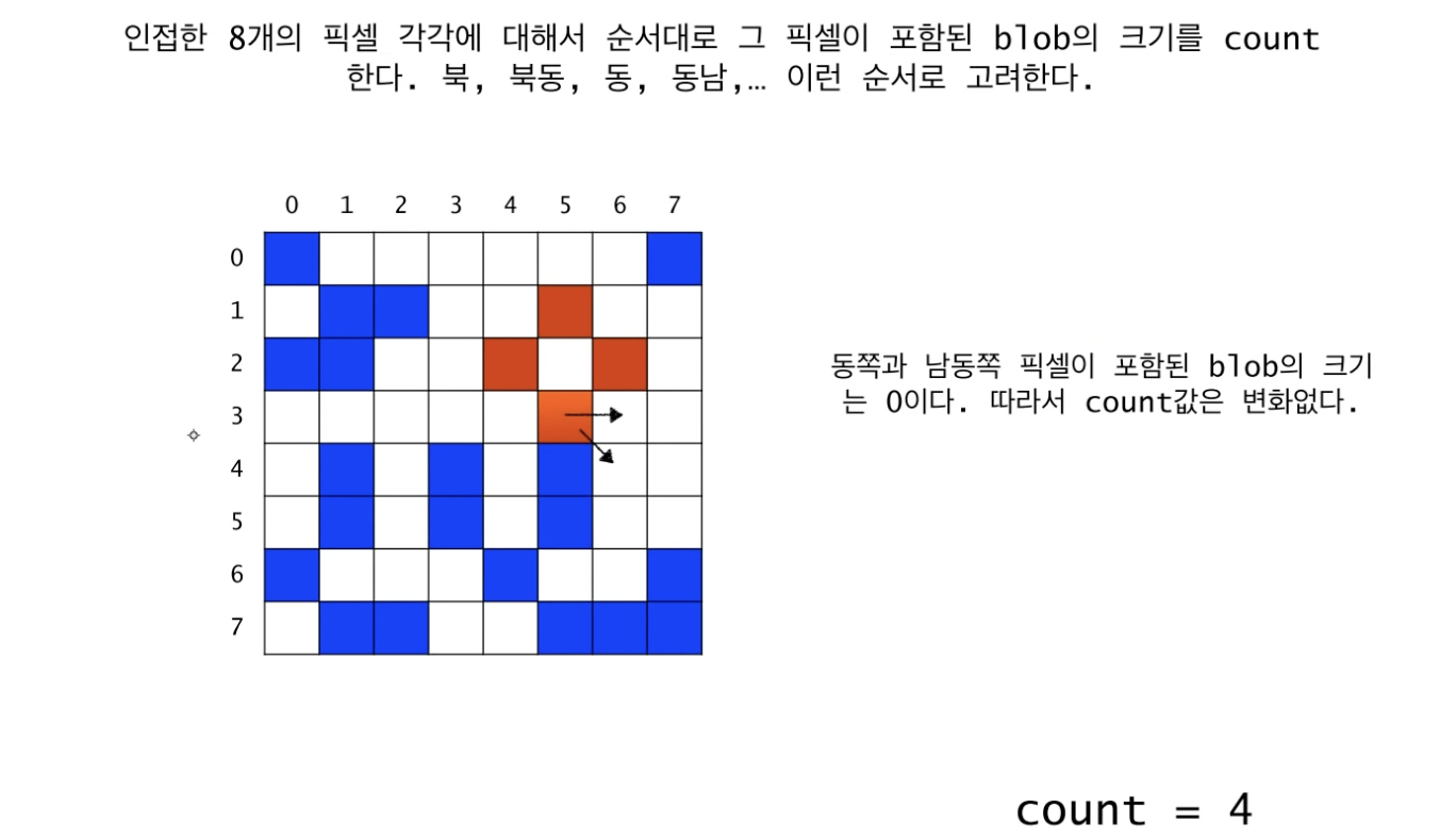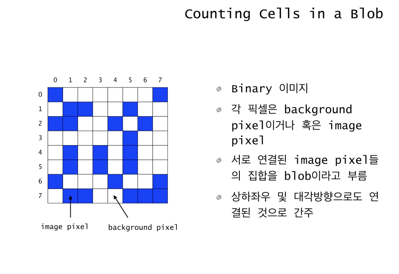 image pixel이 서로 이어지게 연결된 집합을 blob이라고 한다. (상하좌우, 대각방향도 이어진 것으로 간주)