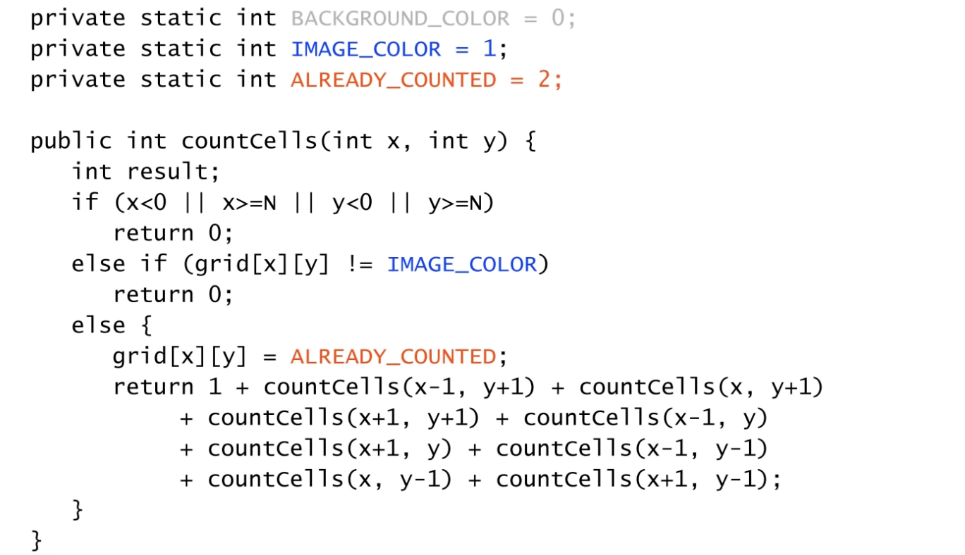 else if(grid[x][y] != IMAGE_COLOUR) return 0; // backgroud pixel이거나 이미 개수를 센 pixel일 경우