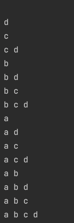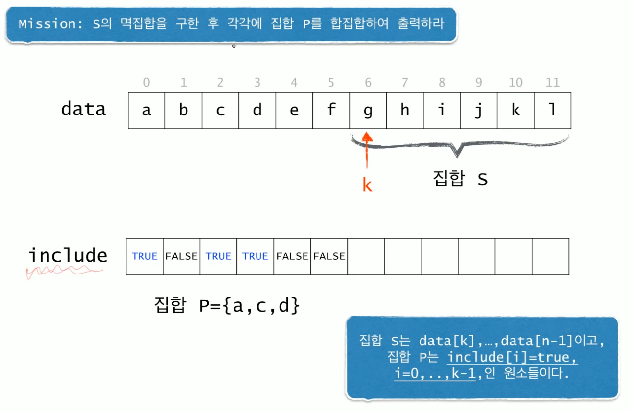 - recursive case : 집합 S의 모든 부분집합들을 구해 P를 합쳐서 출력 ==> 1) 어떤 원소 P가 포함된다 ==> include에서 true인 알파벳들이 포함된다