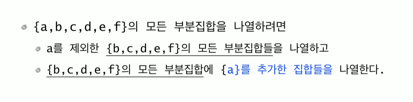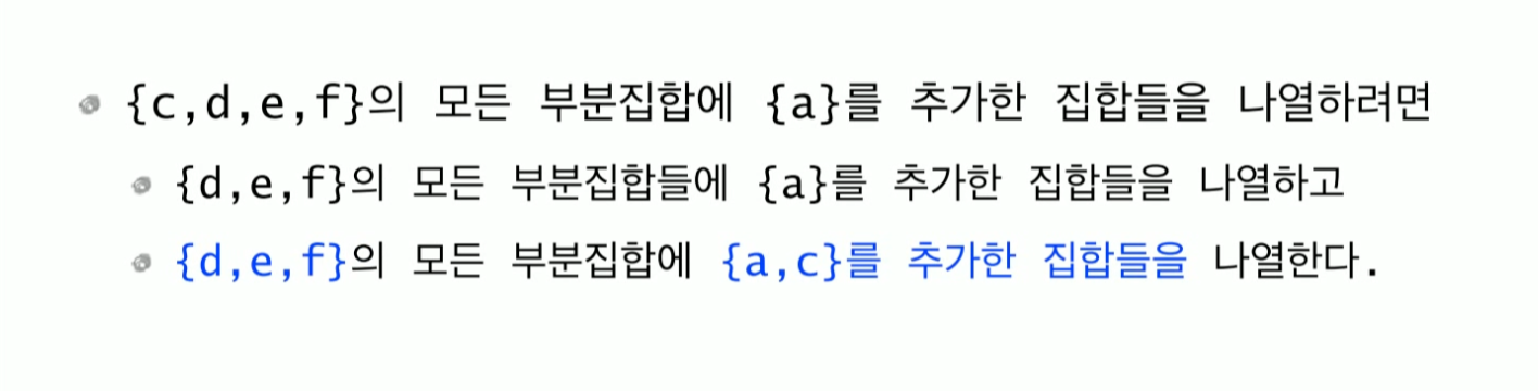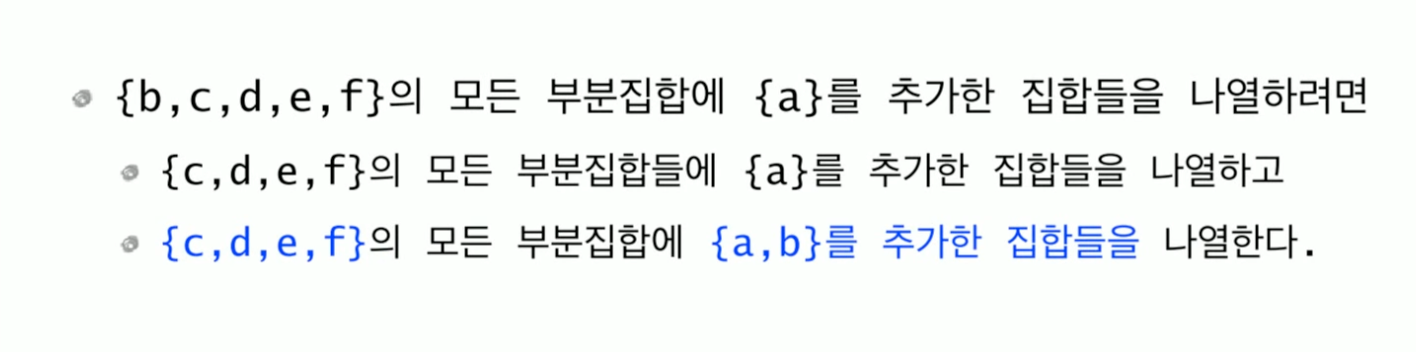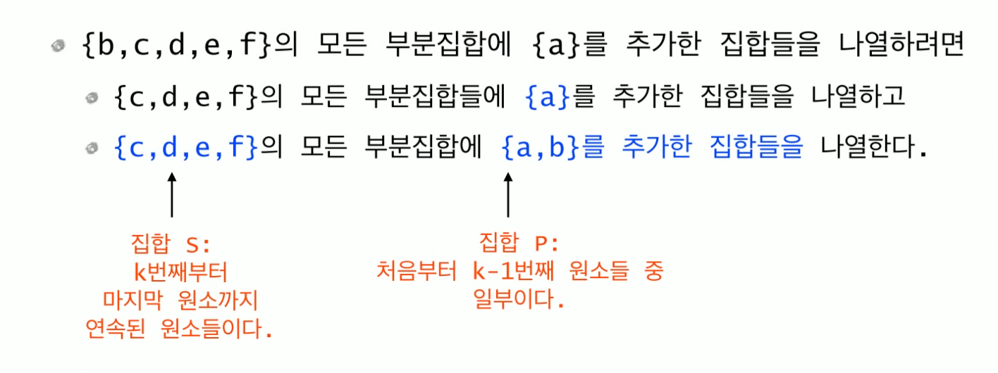 {b, c, d, e, f} 의 모든 부분집합들은 1) 원소 b를 포함한 부분집합들과 2) 원소 b를 포함하지 않는 부분집합들로 나뉜다.따라서 b를 제외한 {c, d, e, f}의 모든 부분집합들에 {a}를 추가한다면 2) 원소 b를 포함하지 않는 부분집합들 이 되고,