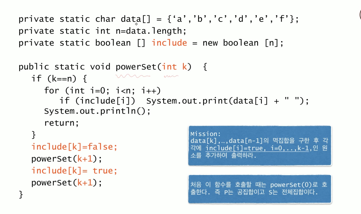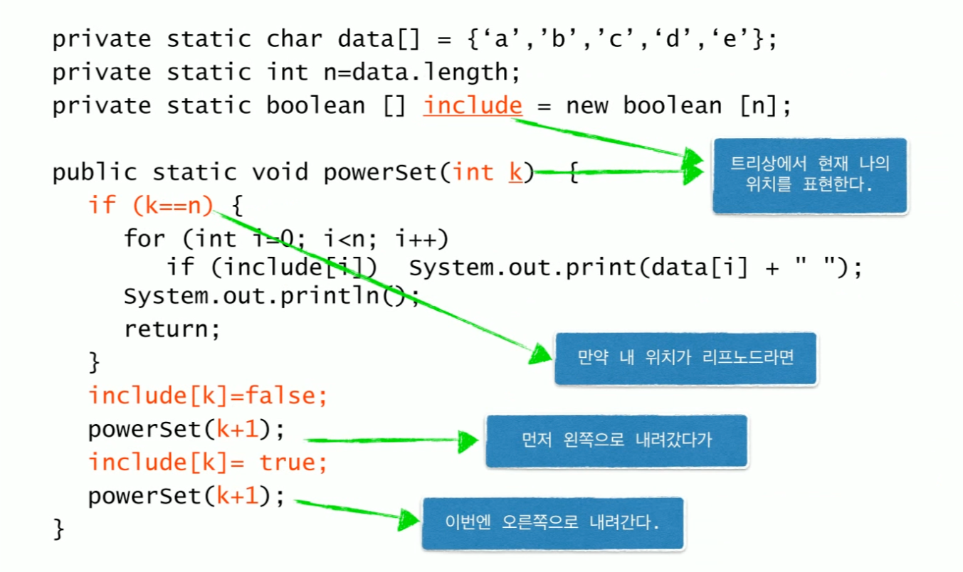 powerSet(k+1); : 원소 k를 포함하는 원소들의 부분집합들을 출력 ==> include인 오른쪽 노드를 타고 내려가는 것