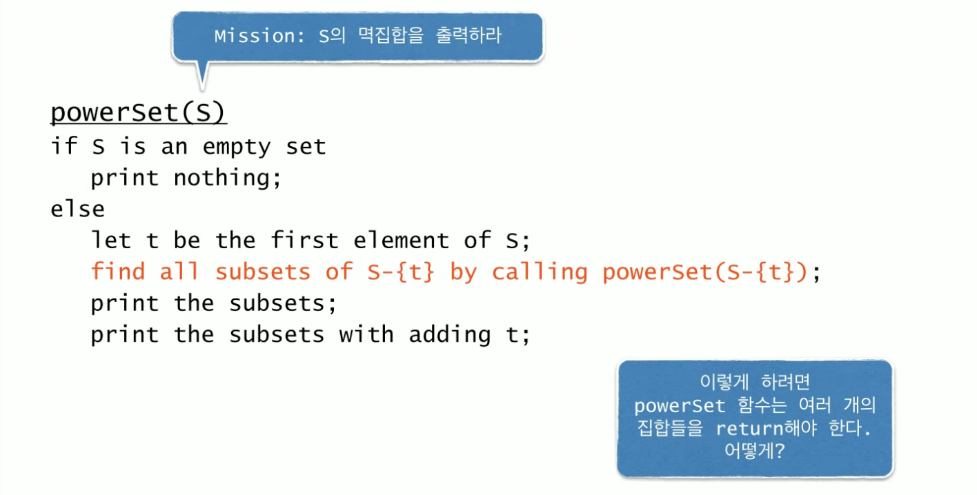 2. powerSet함수가 멱집합을 리턴하지 않고 출력만 한다면 poswerSet(S-{t})의 결과에 t를 추가한 부분집합을 출력할 수가 없다.