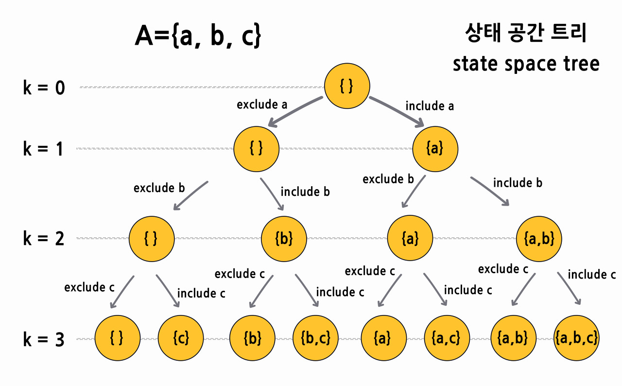 원소 a가 빠졌을 때, 원소 b가 빠졌을 때, 원소 c가 빠졌을 때, 원소 a, b가 빠졌을 때, 원소 a, c가 빠졌을 때, 원소 b, c가 빠졌을 때, 원소 a, b, c가 빠졌을 때의 모든 상황을 규칙적으로 가지치기하며 탐색하는 것이다.