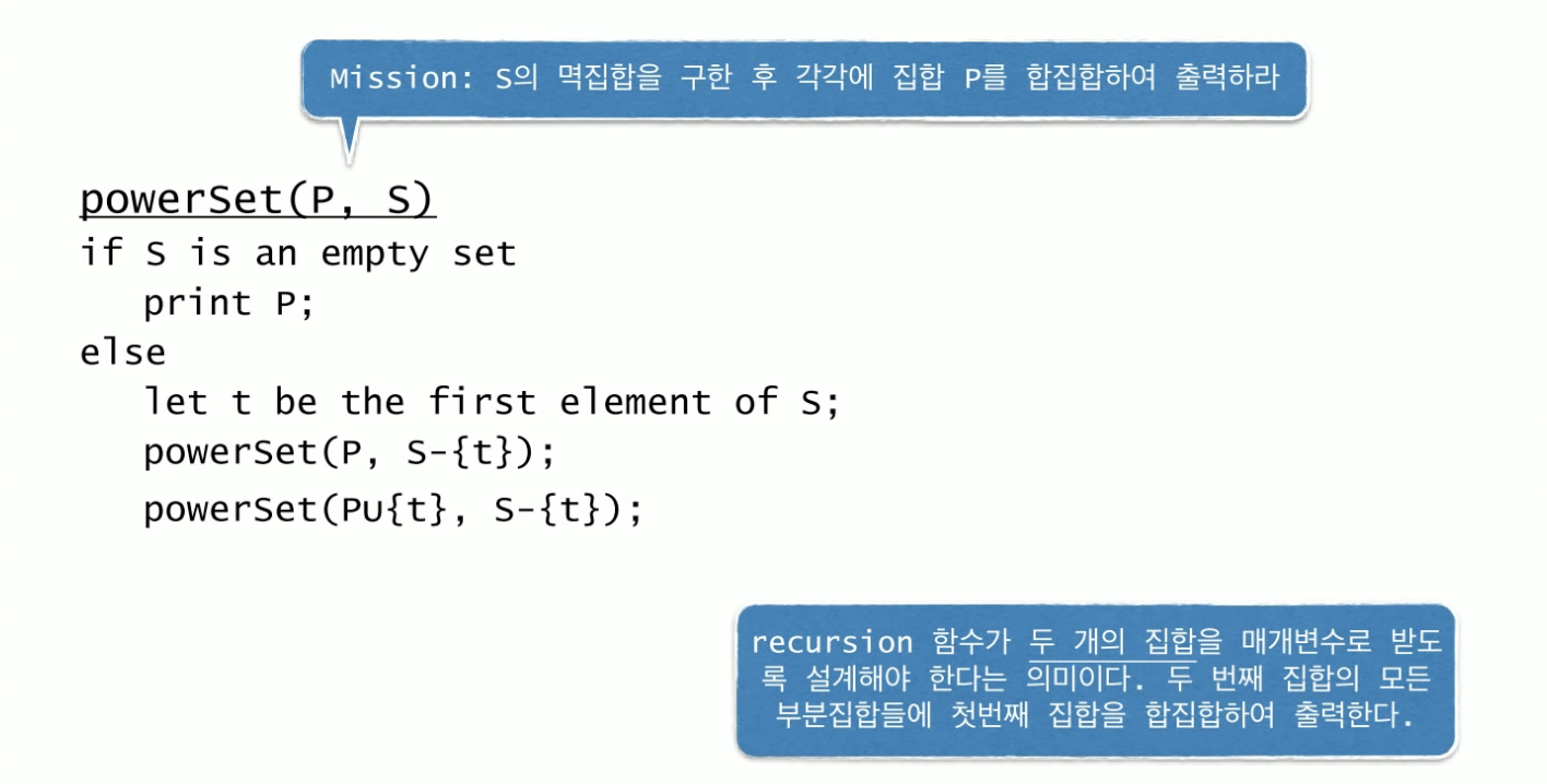 powerSet(P, S-{t}) : t를 제외한 모든 부분집합들