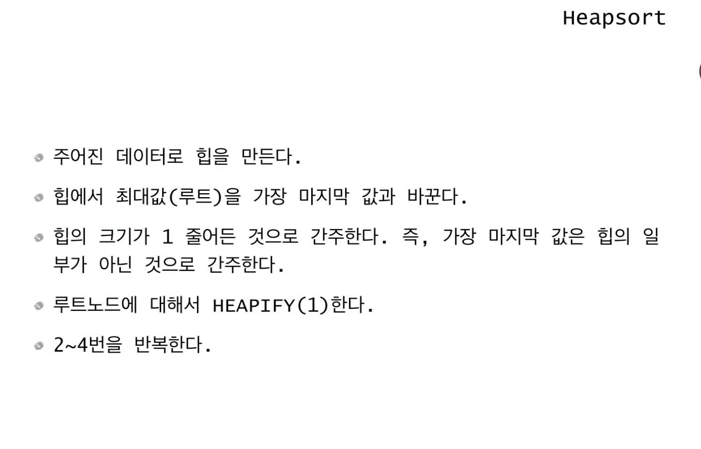 위의 예제들은 root 노드부터 내려오면서(인덱스 1번부터 시작해 n번까지) heapify를 진행했지만