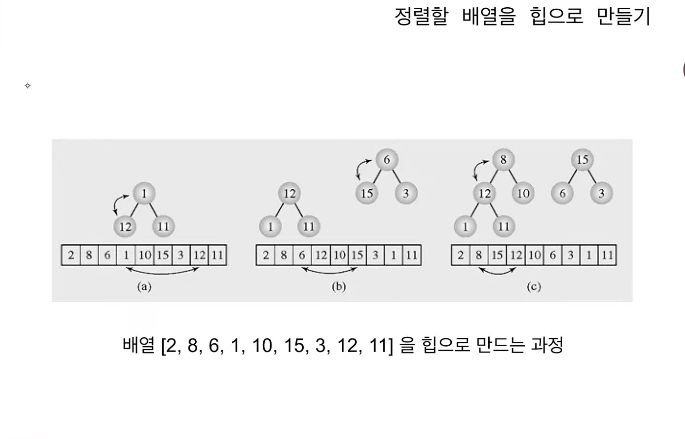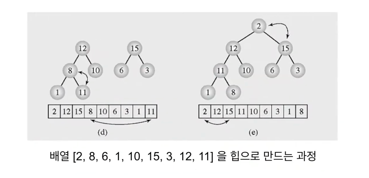 아래 예제들은 마지막 레벨의 마지막 노드부터 올라가면서(인덱스 n/2번부터 시작해 1번까지) heapify를 진행한다.