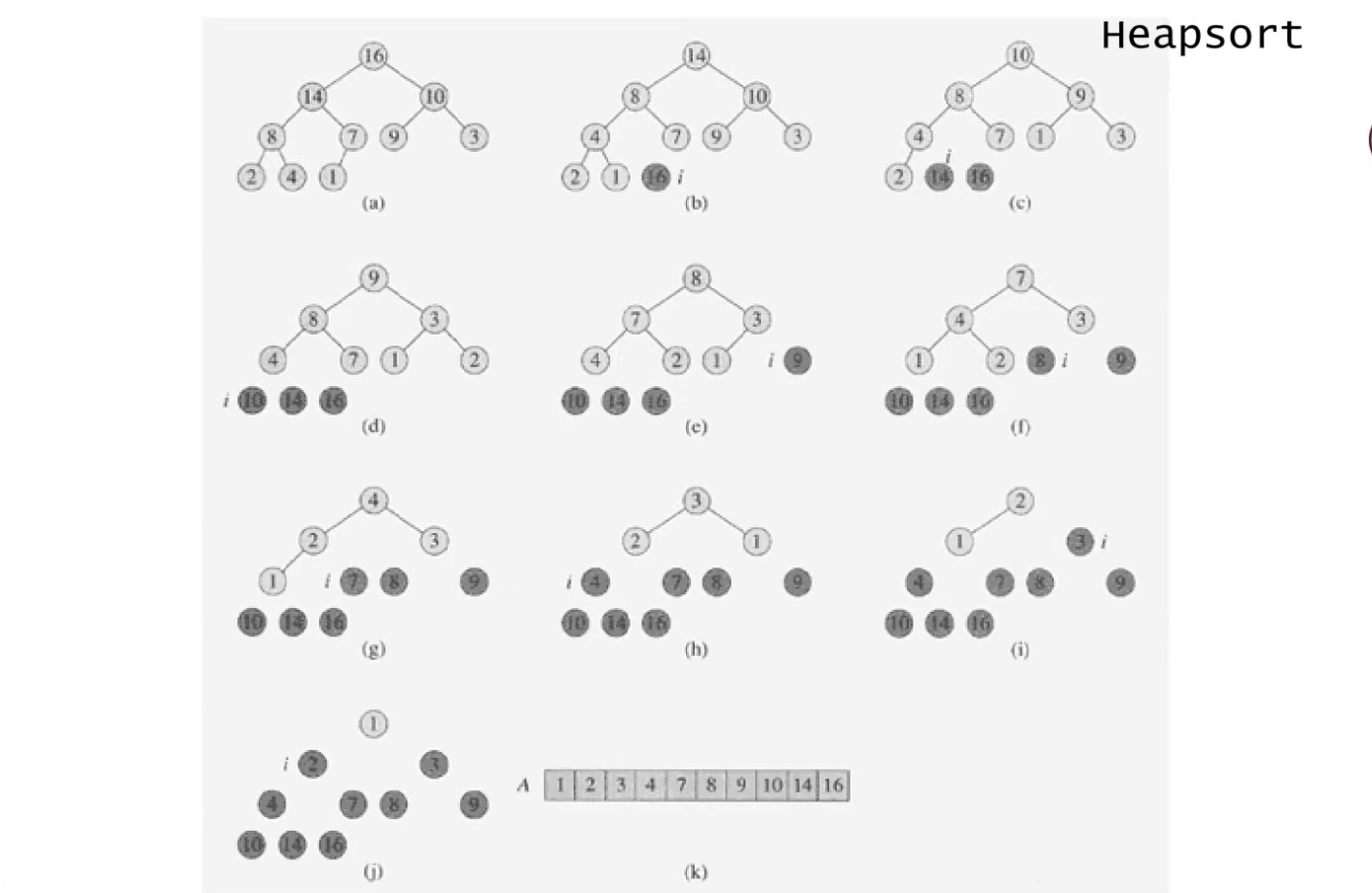 heap인 상태인 (a)에서 루트 노드인 16과 마지막 노드인 1을 바꿔, 16을 제외한 노드들에 대해 heapify를 진행한다 -> (b)가 됨
