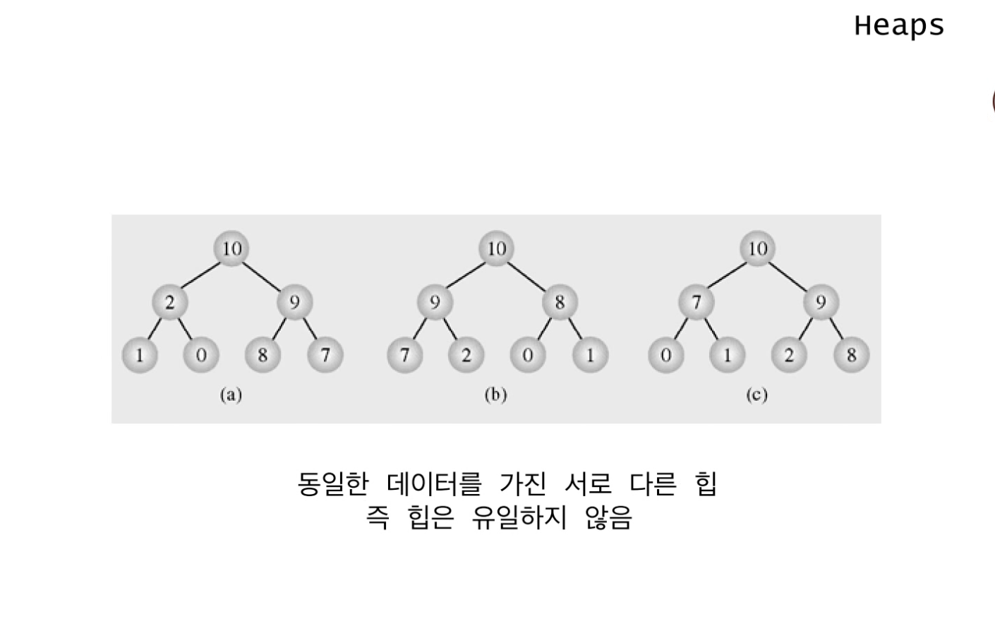 0, 1, 2, 7, 8, 9, 10 7개의 데이터로 여러 개의 힙을 만들 수 있다. = 힙은 유일하지 않다.