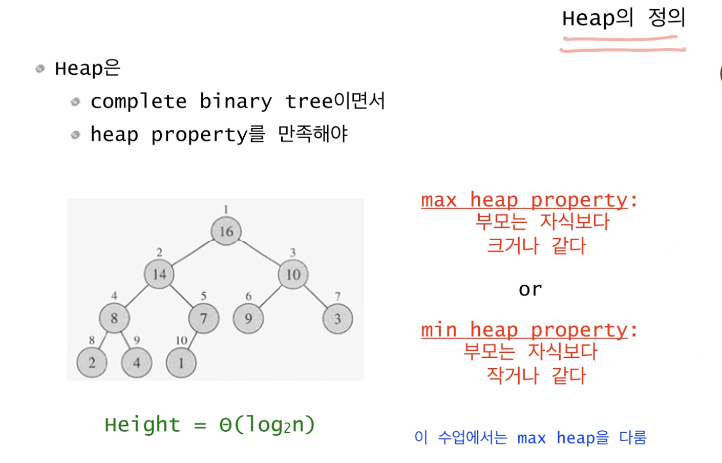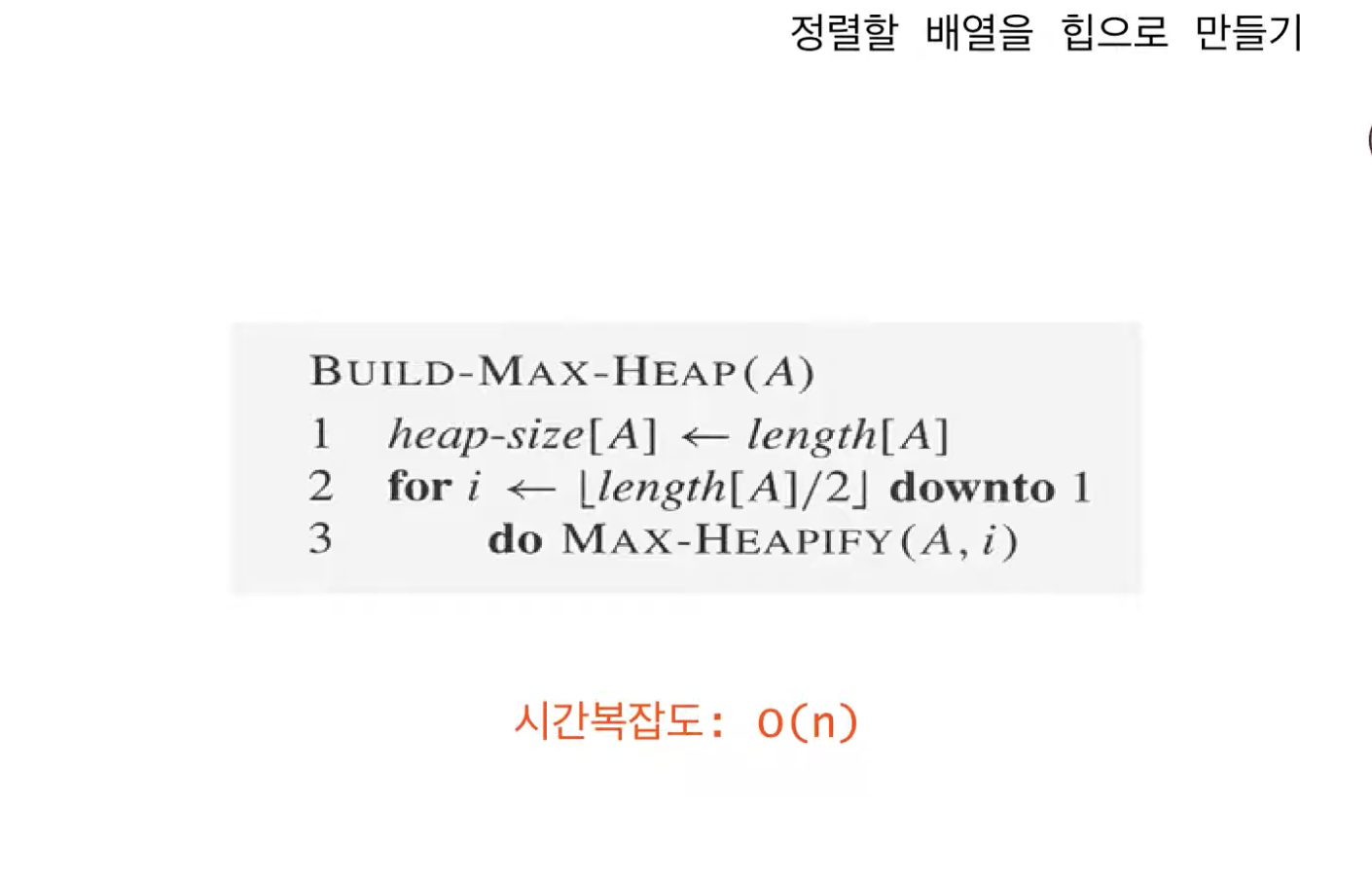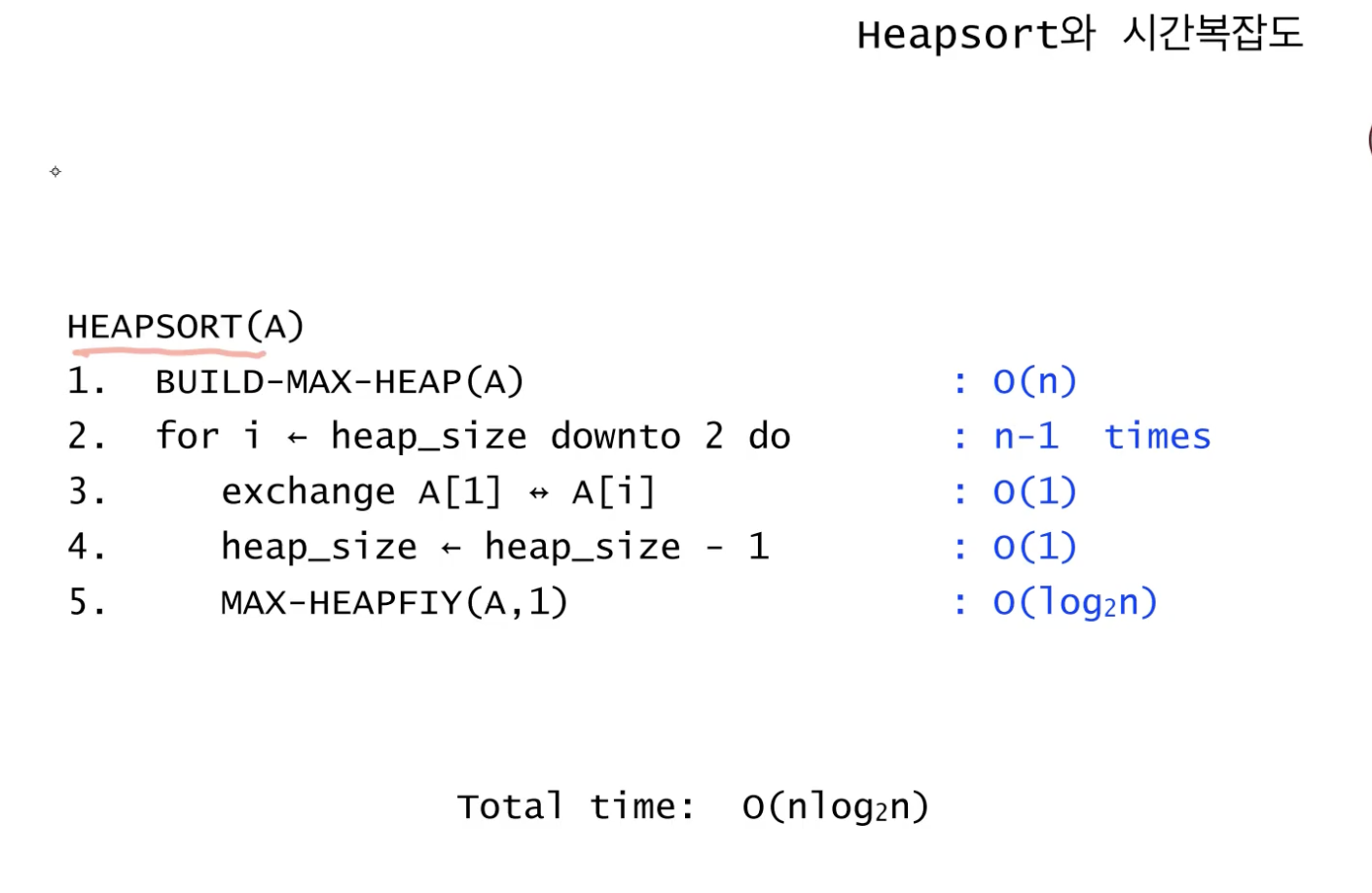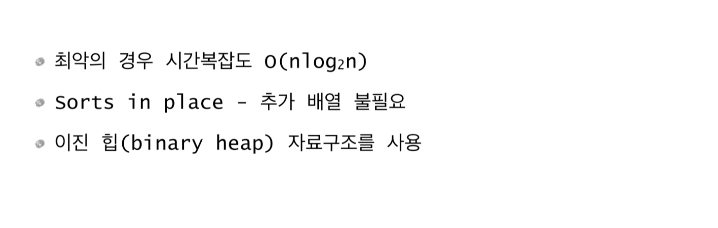 (힙을 만드는데 걸리는 시간복잡도가 O(n)이라고 해도 힙 정렬에 걸리는 시간복잡도는 O(n logn)이니 혼동하지 말자)