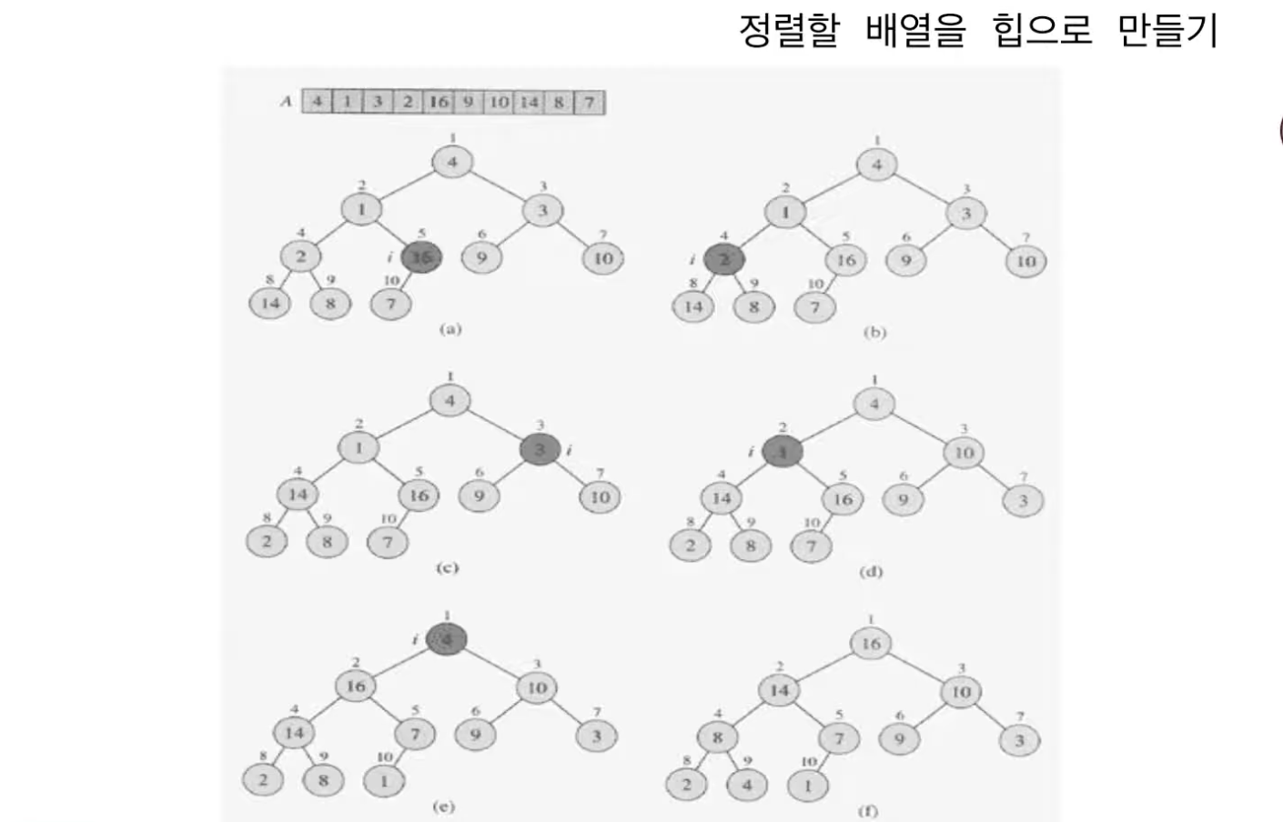 n/2 지점인 5번 노드에서부터 1번 노드까지 heapify를 반복해 최종 (f)의 결과를 얻을 수 있다.