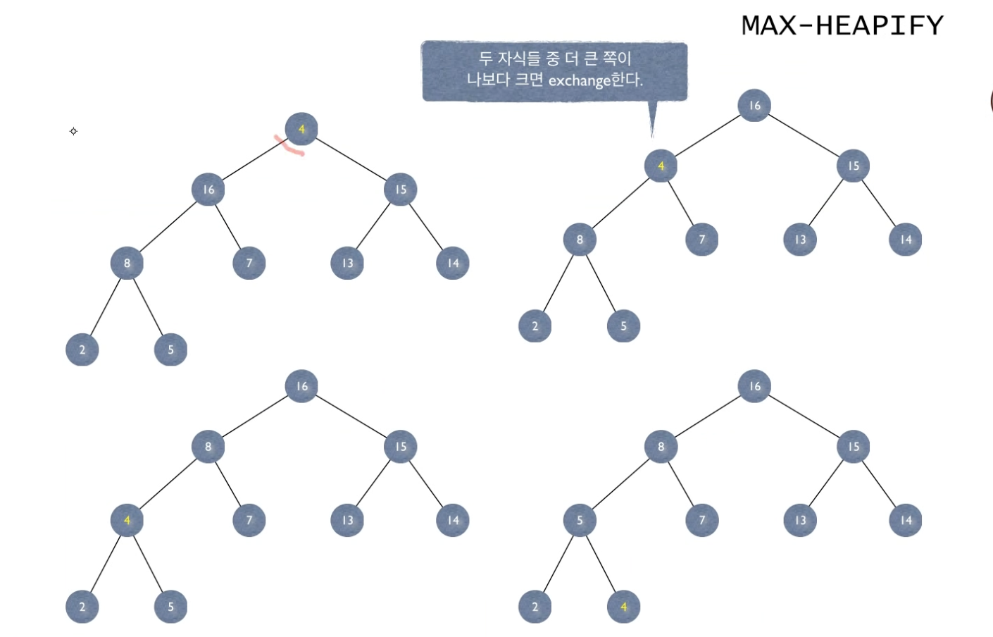 4의 자식 노드 15, 16 중 큰 수인 16과 4가 자리를 바꿔 두 번째 그림이 되고