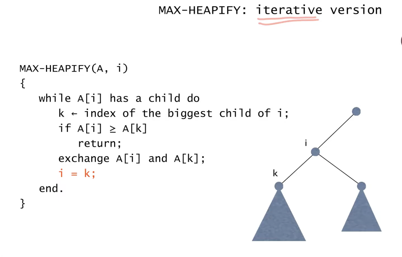 자식 노드 중 더 큰 쪽과 root노드를 바꾸는 과정을 반복문을 사용해서 진행한다.