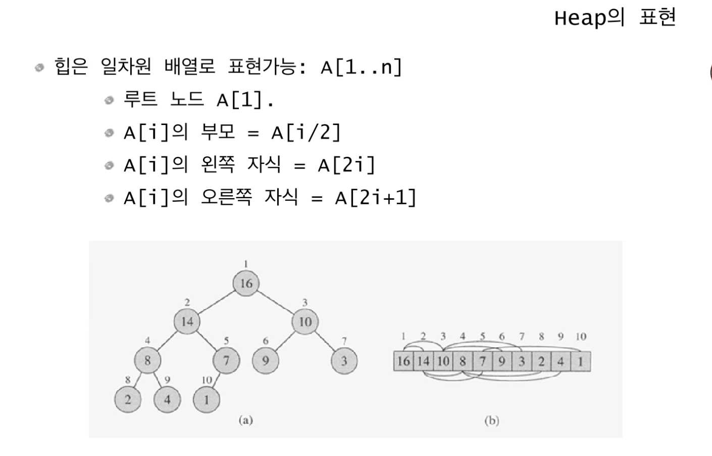 인덱스 1번을 가지는 "16"의 왼쪽 자식은 인덱스 2x1=2번으로 그 값은"14", 오른쪽 자식은 2x1+1=3번으로 값은"10"이다.