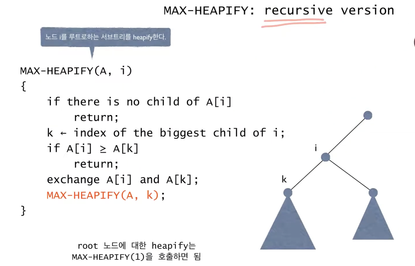 자식 노드 중 더 큰 쪽과 root노드를 바꾸는 과정을 recursive하게(재귀호출) 진행한다.