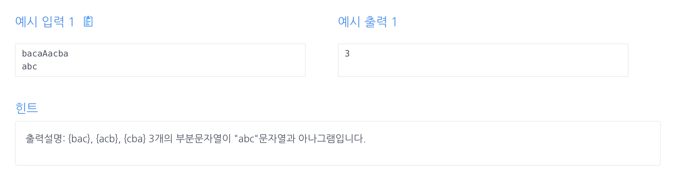 아나그램 판별시 대소문자가 구분됩니다. 부분문자열은 연속된 문자열이어야 합니다.