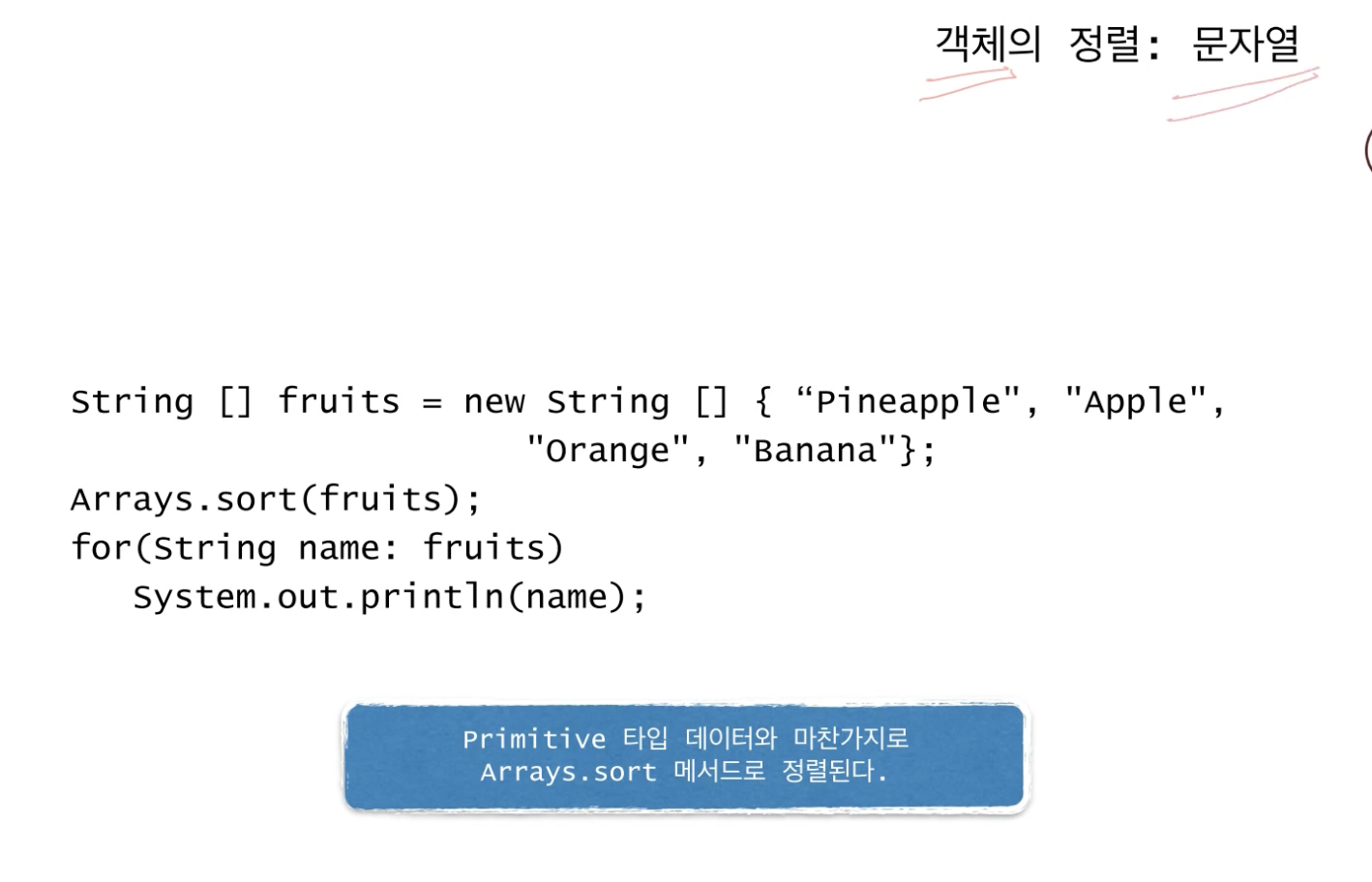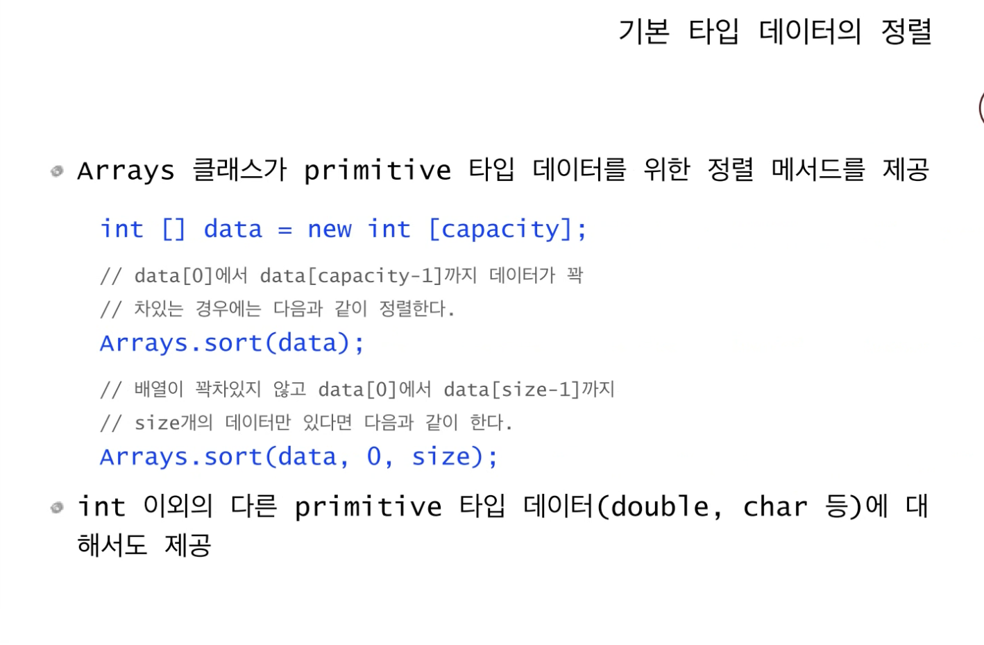 Arrays 클래스가 sort()라는 메서드로 int, char, String 등 primitive 타입 데이터를 자동으로 정렬해준다.