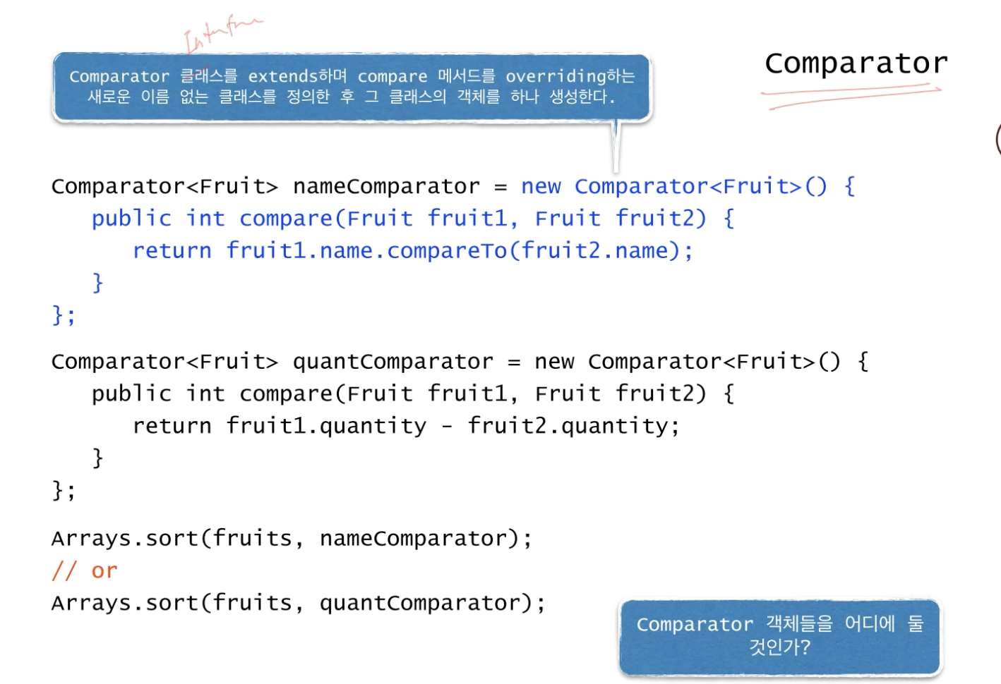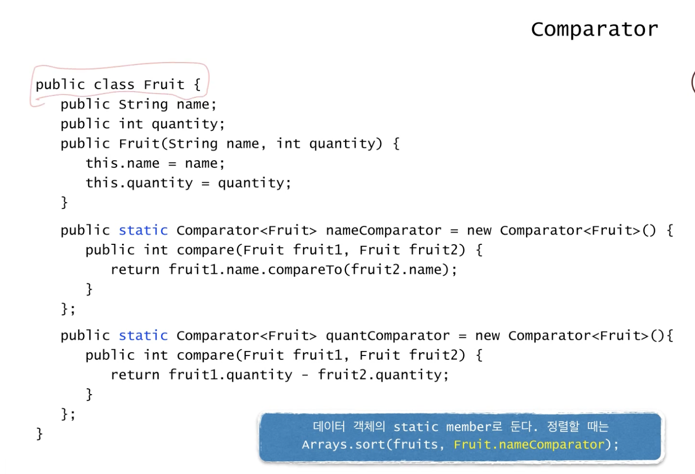 Comparator 객체들은 그냥 Fruit 클래스 안에 두고 필요할 때마다 Array.sort(배열, Comparator 객체) 형식으로 꺼내쓴다.