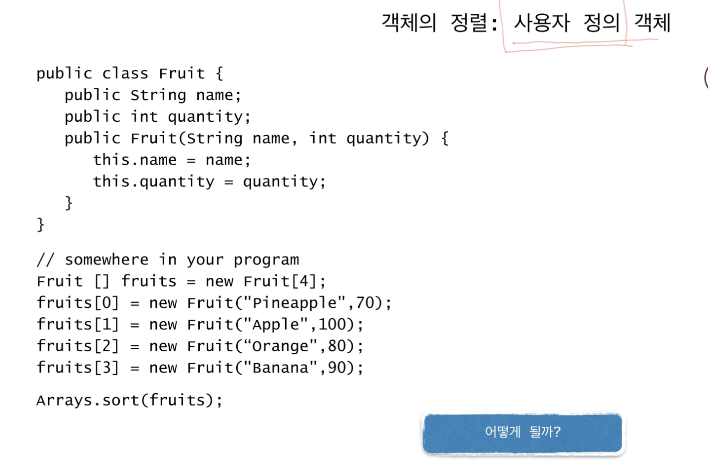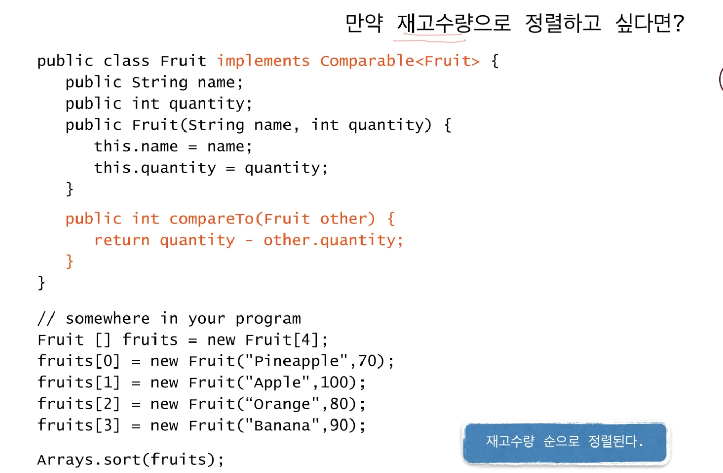 하지만 Fruit 객체의 경우 문자열의 값과 정수 값 두 개를 가지고 있기 때문에 무엇을 기준으로 정렬되어야 할까?