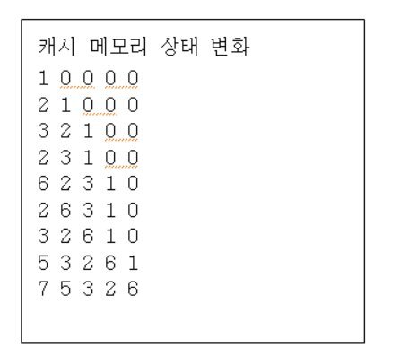 마지막 작업 후 캐시메모리의 상태를 가장 최근 사용된 작업부터 차례로 출력합니다.