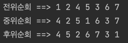 "뿌리 노드"의 탐색 순서에 따라 전, 중, 후로 나눌 수 있다.