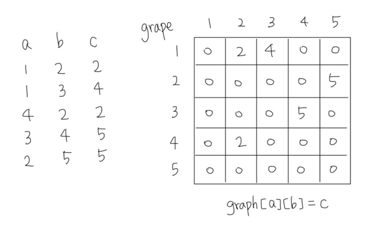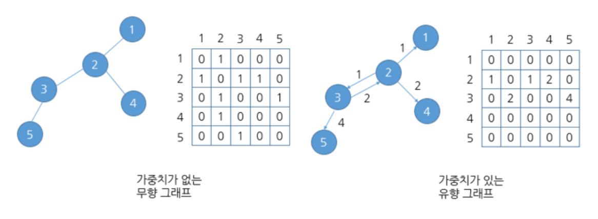 : 행렬에서 각 간선의 가중치 값이 저장된다. 이 경우 가중치가 0인 것과 간선이 없는 것이 구별돼야 한다.