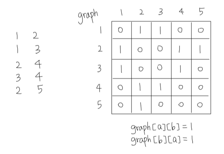 graph[a][b] = 1 혹은 0이라고 표현하는 것과 graph[b][a] = 1 혹은 0이라고 표현하는 것이 같은 것을 의미한다.